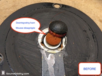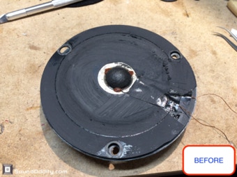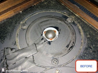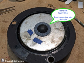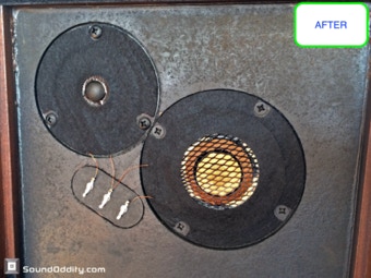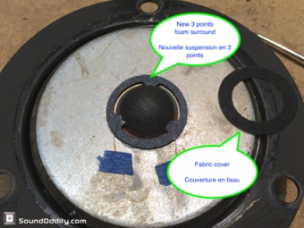 Le tweeter de ces enceintes est systématiquement hors d’usage, il faut soit le remplacer ce qui est d’habitude la solution retenue par les propriétaires, soit le remettre à neuf. Avec mon client nous avons choisi de garder ce tweeter à dome papier particulier et de le restaurer au mieux. Le concept d’origine avec une suspension en trois points a été partiellement gardé à ceci près qu’un tissu de protection contre les poussières a été posé devant la suspension. C’est un choix discutable car la suspension devient alors en partie émettrice de fréquences sonores au contraire de la suspension d’origine. Il aurait fallu pousser le travail un peu plus loin et faire de la mesure acoustique, peut-être une autre fois… Si vous aussi vous souhaitez garder votre tweeter avec dome papier dans vos AR3a, Sound Oddity vous propose cette restauration en standard, avec ou sens tissu de protection, veuillez me contacter pour en savoir plus.