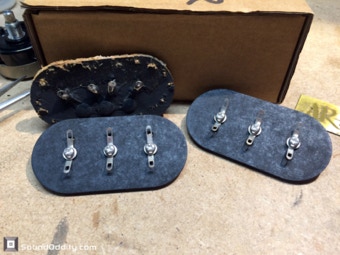 Finalement l’ébénisterie a été rafraichie et un gros travail a été réalisé sur la face avant pour la rendre un peu moins gros doigts que d’origine. Une nouvelle plaque de connexion des médiums et tweeters a été réalisée à la découpe laser. Les accidents de niveau autour des tweeters et médiums ont été compensés par des feutres découpés laser et collés sur les chassis d’origine. Enfin la grille a été restaurée façon vintage avec une toile de lin écru et une plaque d’identification inspirée de l’originale a été réalisée en bois massif avec gravure laser.
