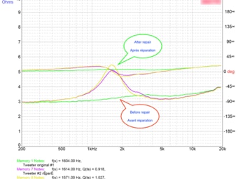 Les boomers ayant été restaurés par un autre intervenant, ils ont été gardés en l’état, juste rafraichis après quelques tests… Les médiums sont aussi passés à la mesure d’impédance et générateur de fréquences et tout semblant dans les clous, ils n’ont pas fait l’objet d’une restauration à proprement parler.