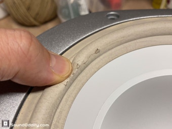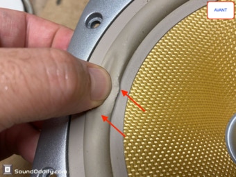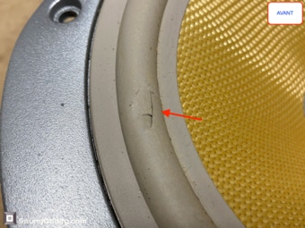 Si vous n’êtes pas expert, les symptômes sonores sont un manque évident de grave et des vibrations/distortions dans le son. Les symptômes visuels sont une membrane qui ne bouge pas ou difficilement lorsque vous appuyez prudemment sur le cone avec les cinq doigts de la main, aussi si vous appuyez sur la suspension elle même, elle sera dure et cassante. Si la suspension n’a pas encore atteint ce stade critique, un indice de sa dégradation en cours sera l’apparition de craquelures lorsque vous la touchez.
