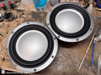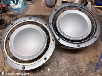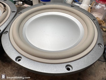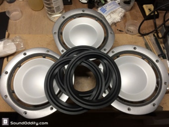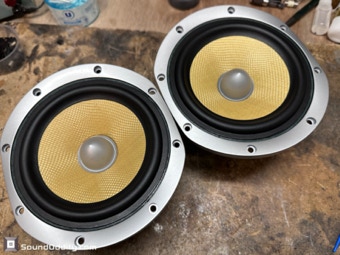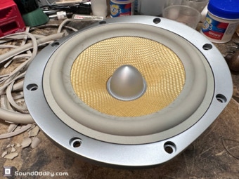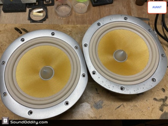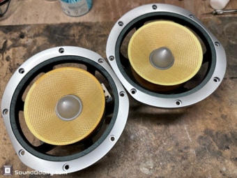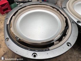 Ci dessous quelques restaurations standards de ces boomers à membrane aluminium et boomers médiums à membrane Kevlar B&W des séries DM600, DM601, DM602, DM603, DM604 et probablement d’autres, avec une suspension en caoutchouc gris qui devient dure et cassante et qui freine totalement ou en partie la reproduction des basses fréquences.