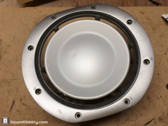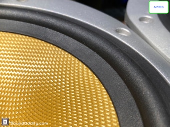 La réparation consiste à retirer la suspension d’origine, a nettoyer les résidus de colle sur le pourtour de la membrane sans l’abîmer et à recoller une suspension neuve avec un centrage parfait de la bobine dans l’entre fer. Les nouvelles suspensions sont spécialement fabriquées pour cette série de haut-parleur et sont noires. C’est en effet l’absence de noir de carbone dans ces suspensions grises qui les rends si fragiles dans le temps. Vous êtes vous déjà demandé pourquoi les pneus sont noirs ? Vous avez maintenant une partie de la réponse…