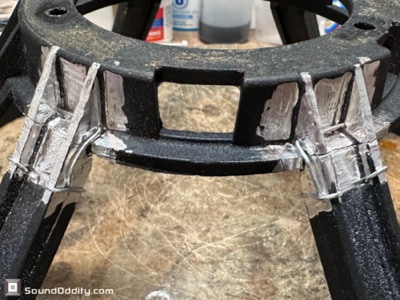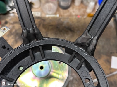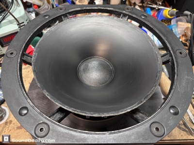 En cours de nettoyage des membranes, notez comme la membrane est abîmée par le collage de la précédente suspension. En fait cette suspension n’était pas adaptée et empiétait trop sur le cone…