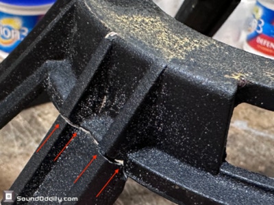 Diagnostic : Suspensions détériorées, membranes abîmées par un précédent intervenant (pourtant de renom sur Paris…) à cause de l’utilisation d’un solvant inadapté, une membrane coupée (coup de cutter ?), un chassis cassé à cause d’une chute probablement chez le précédent intervenant car mon client n’en savait rien…