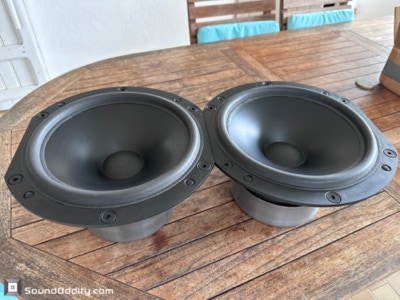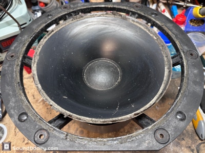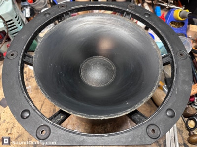 Travaux réalisés : Nettoyage des résidus de suspensions et de colle, restauration des membranes au mieux possible, dépose d’un équipage mobile pour réparation du chassis cassé, réparation du chassis cassé, remontage de l’équipage mobile déposé, montage de nouvelles suspensions adaptées. Mesure d’impédance après intervention, contrôles au générateur de fréquences.