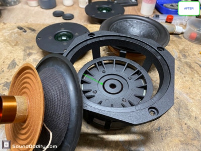 Travaux réalisés : Dépose des équipages mobiles des boomers et des tweeters, nettoyage des entre fers, traitement anti corrosion et peinture des entre fers, remontage des équipages mobiles. Remplacement du ferrofluide et des mousses acoustiques. Traitement des domes des tweeters et des membranes des boomers. Mesure d’impédance, contrôles au générateur de fréquences.