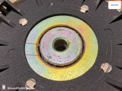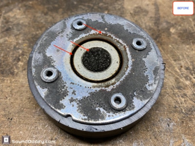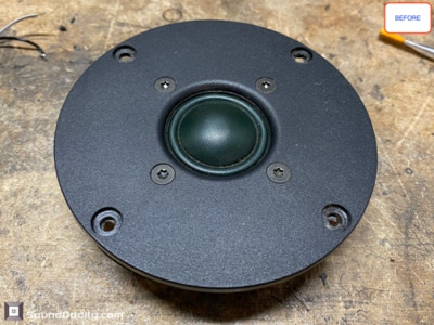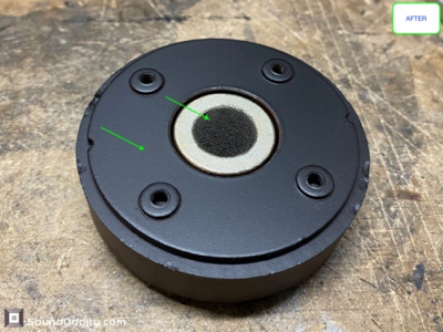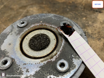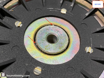 Moteur tweeter Avant restauration. Corrosion, ferrofluide à remplacer, mousse acoustique désagrégée