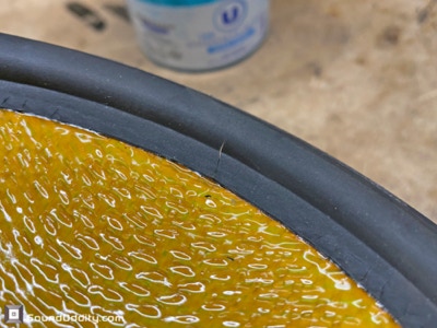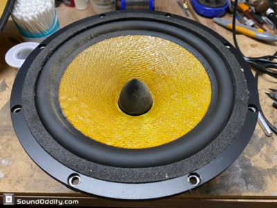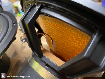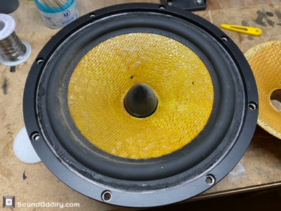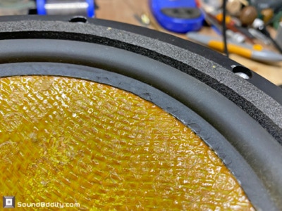 Diagnostic : Haut-parleurs muets, traitement viscoélastique de la surface du kevlar très abîmé, suspensions craquelées,