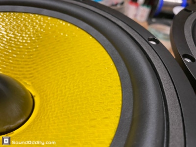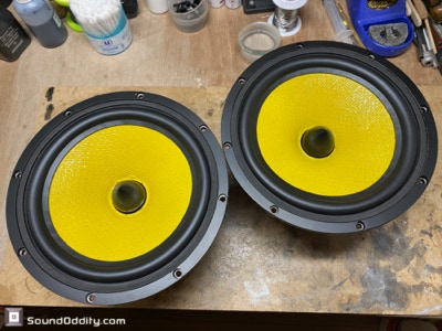 Travaux réalisés : Inspection des bobines, réfection des connections à la bobines, dépose des suspensions d’origine, nettoyage et traitement des membranes, remise en peinture des membranes, nettoyage des entre fers, remontage des équipages mobiles avec de nouvelles suspensions, traitement viscoélastique des membranes en 4 couches, découpe laser d’un nouvel enjoliveur en mousse, mesures d’impédances et tests au générateur de fréquences.
