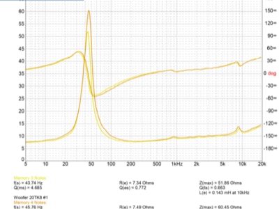 Impédance des deux boomers médiums restaurés. A priori la membrane de fractionne pas réellement avant 8KHz !