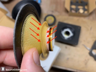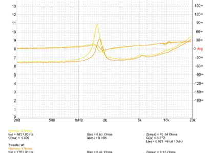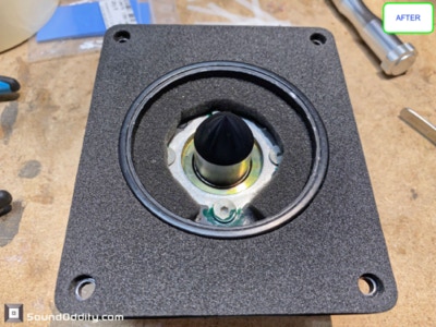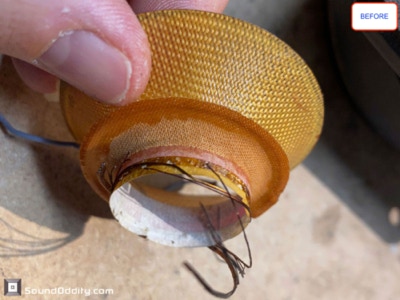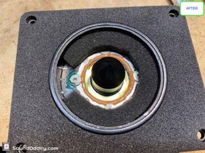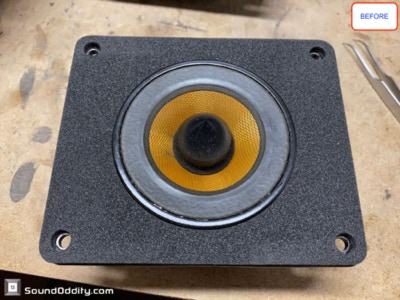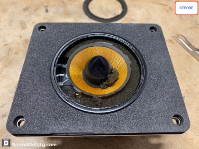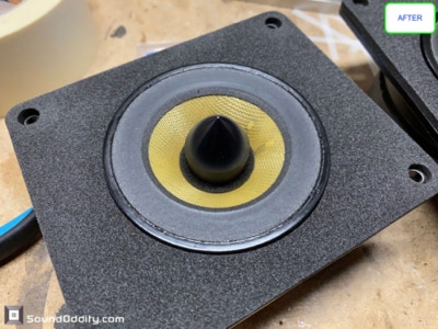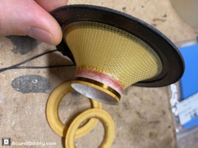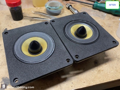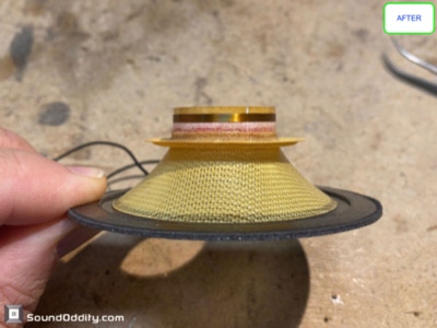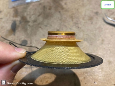 Travaux réalisés : Dépose des équipages mobiles, nettoyage des restes des suspensions d’origine et de la mousse intérieure désagrégée, nettoyage des entre fers, ré-assemblage des équipages mobiles neufs, pose d’une nouvelle mousse acoustique, montage des équipages mobiles neufs, mesures d’impédances et tests au générateur de fréquences.
