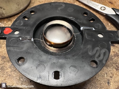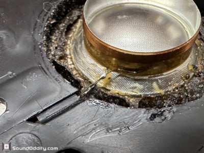 Diagnostic : Suspension désagrégée bricolée avec un colles Néoprène, tresses de connexion à la bobine bricolées, bobine décollée. Un vrai travail de bourrin qui mérite sa place au musée des horreurs…