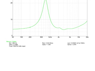 Travaux réalisés : Nettoyage de la membrane au mieux possible sans edomager le Tioxyde, réfection des connexions à la bobine, montage d’une nouvelle suspension en cuir synthétique Sound Oddity, nettoyage du chassis et du moteur, remontage de l’équipage mobile restauré, mesure d’impédance et tests…