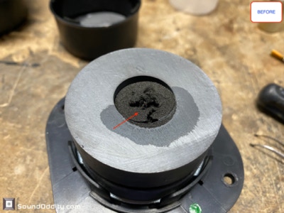 Diagnostic : Une membrane abîmée. Suspensions désagrégées, mousse acoustique en fin de vie, connexions à la bobine en fin de vie, une bobine décollée…