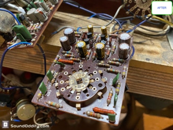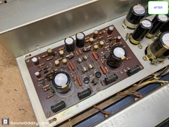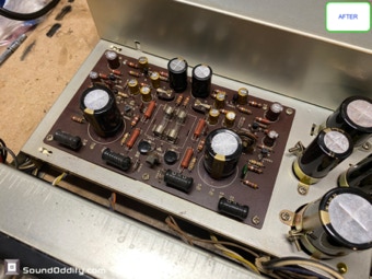 Carte d’entrée Après restauration. Condensateurs Nichicon Fine Gold, transistors sélection Sound Oddity appairés.