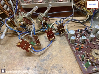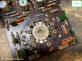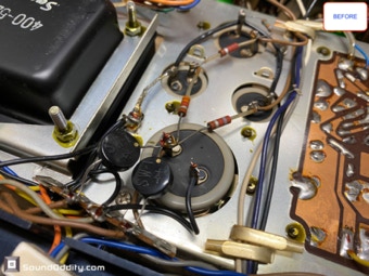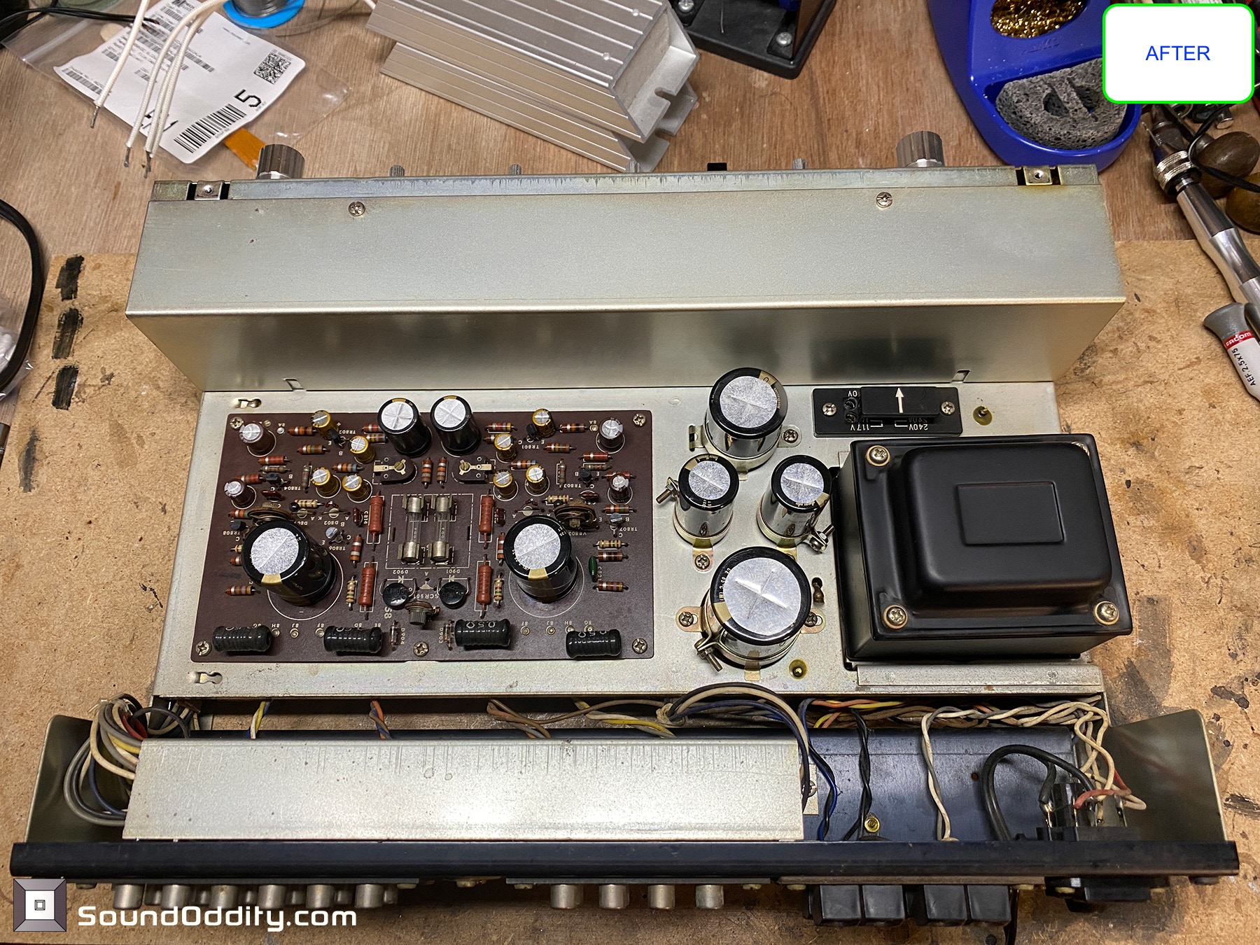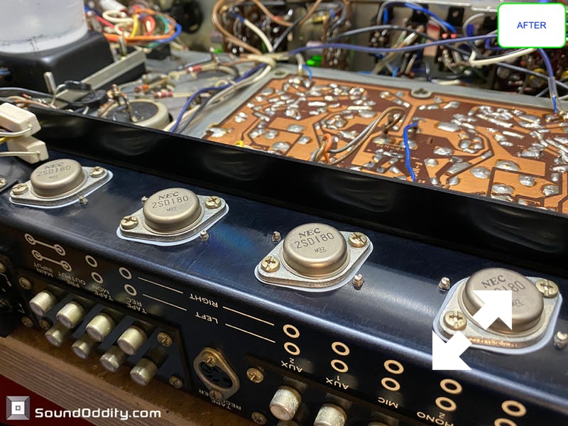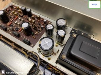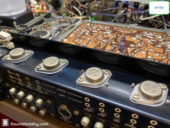 ‍Le choix des composants et les astuces utilisées pour sa remise à neuf et optimisation sont le fruit d’un long et coûteux travail de recherche ainsi que de nombreuses itérations pour arriver à ce résultat qui surpasse la version d’origine. La symétrisation de l’étage de puissance par l’ajout maitrisé d’une diode Baxandall et la modification de l’étage de gestion du bias réalisés par Sound Oddity en standard sur cet appareil apportent plus de finesse et d’ouverture, on monte clairement d’un cran dans une sonorité plus haut de gamme. Tous les petits transistors sont remplacés et appairés et parfois les transistors de sortie suivant l’état des originaux. Cette sélection de composants est gardée secrete (références de certains composants effacées) et nul part ailleurs vous n’entendrez un Sansui AU-555 sonner de cette façon. Si vous avez un AU-555, AU-555a, AU-222, BA-60 non restauré ou pas correctement restauré, Sound Oddity est l’atelier qu’il vous faut ! Je fais la remise à neuf et optimisation de ces appareils en standard et propose différentes versions suivant votre budget. Visitez la rubrique Livraison et contactez moi pour plus d’informations.