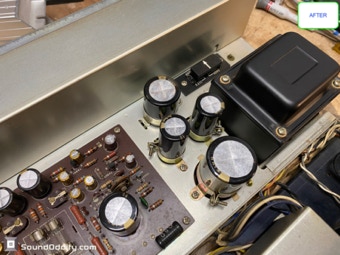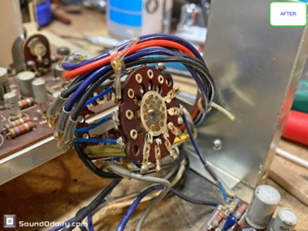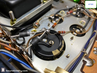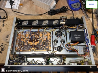 Après restauration, sans le capot. Désolé pour la rotation de l’amplificateur sur la photo ;-).