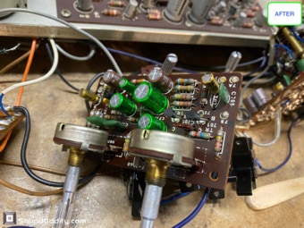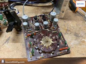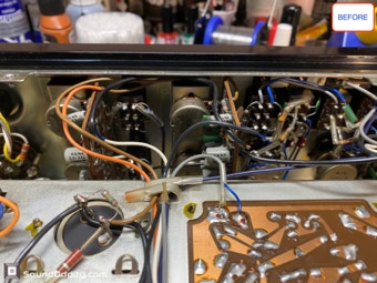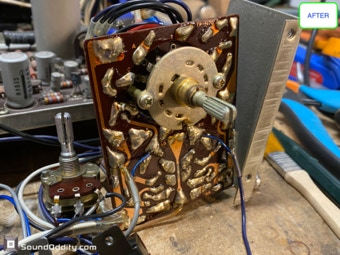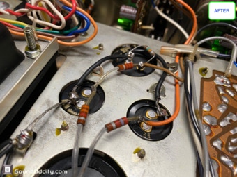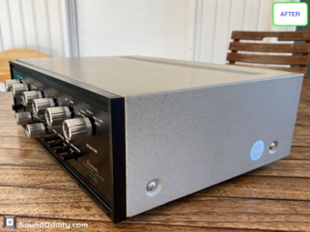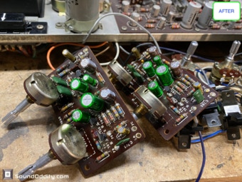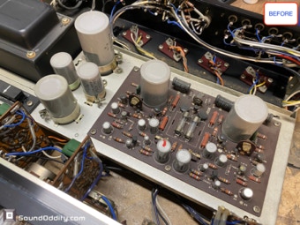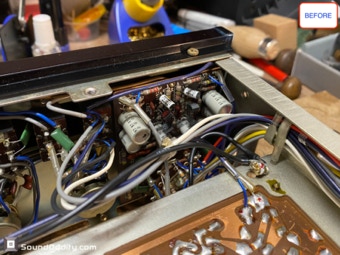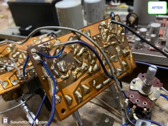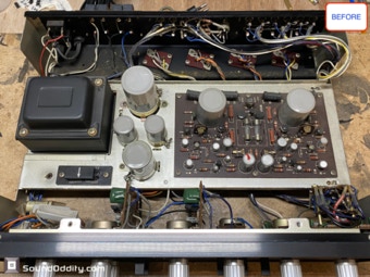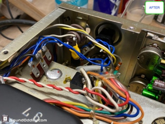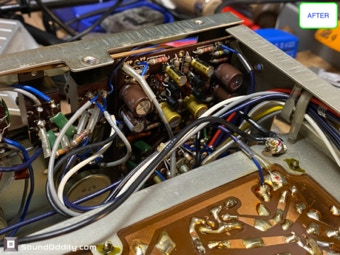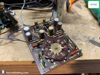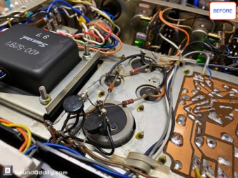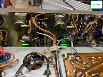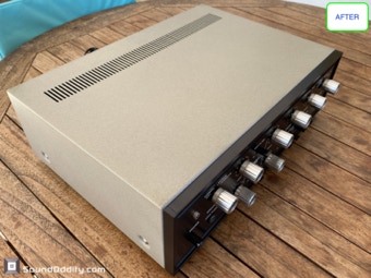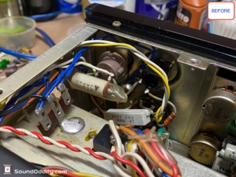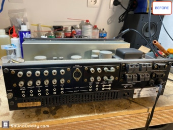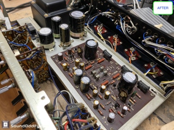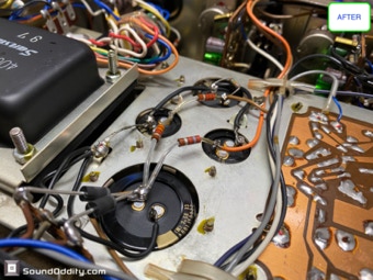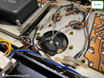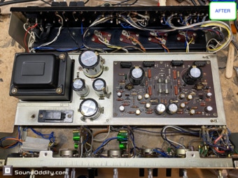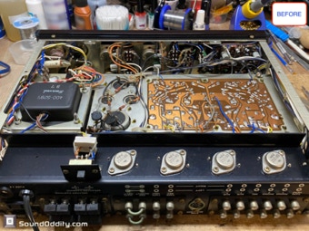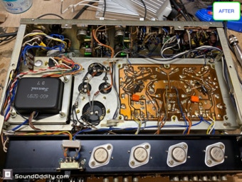 Le choix des composants et les astuces utilisées pour sa remise à neuf et optimisation sont le fruit d’un long et coûteux travail de recherche ainsi que de nombreuses itérations pour arriver à ce résultat qui surpasse la version d’origine. La symétrisation de l’étage de puissance par l’ajout maitrisé d’une diode Baxandall et la modification de l’étage de gestion du bias réalisés par Sound Oddity en standard sur cet appareil apportent plus de finesse et d’ouverture, on monte clairement d’un cran dans une sonorité plus haut de gamme. Tous les petits transistors sont remplacés et appairés et parfois les transistors de sortie suivant l’état des originaux. Cette sélection de composants est gardée secrete (références de certains composants effacées) et nul part ailleurs vous n’entendrez un Sansui AU-555 sonner de cette façon. Si vous avez un AU-555, AU-555a, AU-222, BA-60 non restauré ou pas correctement restauré, Sound Oddity est l’atelier qu’il vous faut ! Je fais la remise à neuf et optimisation de ces appareils en standard et propose différentes versions suivant votre budget. Visitez la rubrique Livraison et contactez moi pour plus d’informations.