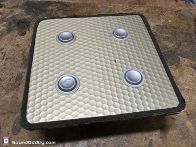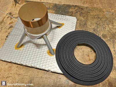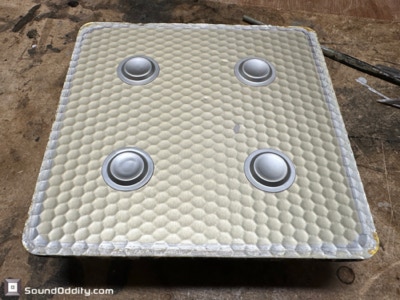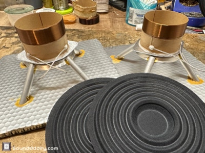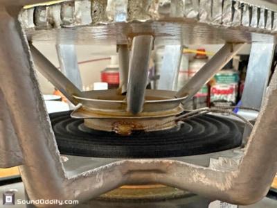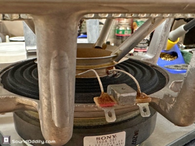 Travaux réalisés : Dépose des équipages mobiles, inspection des spiders et des bobines, dépose des bobines, nettoyage des membranes, montage de nouvelles bobines Sound Oddity et de nouveaux spiders Kurt Mueller, remontage des équipages mobiles et montage de nouvelles suspensions en cuir synthétique Sound Oddity.