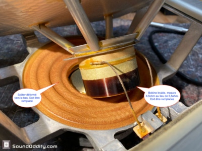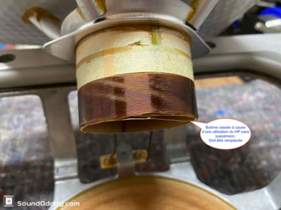 Diagnostic : Haut-parleurs mal emballés ayant conduit à la déformation du spider. Bobines très abîmées à remplacer.