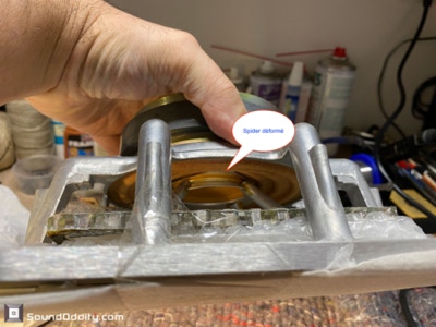 En plus de s’être décollé de la bobine, le spider est en effet déformé, on constate que la bobine a chauffé et mesure hors spécifications