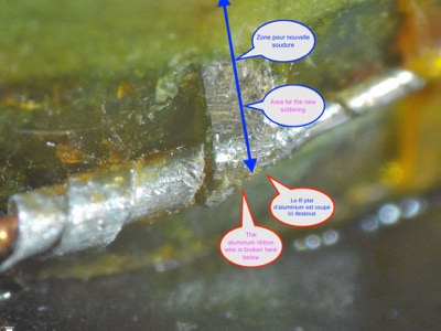 Analyse de la situation, la réparation sera très délicate. Reprendre la soudure directement sur l’existant est quasiment voué à l’échec. Il faut nettoyer tout ça correctement et faire une nouvelle connexion.
