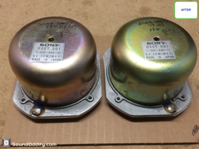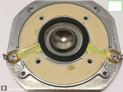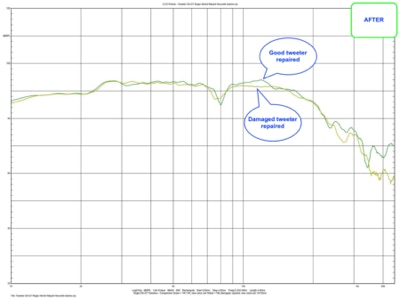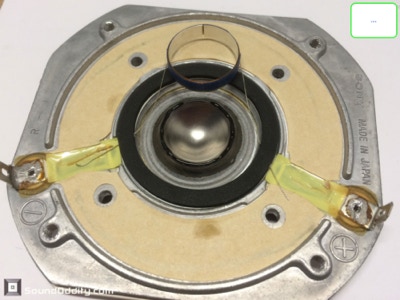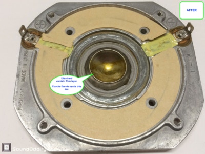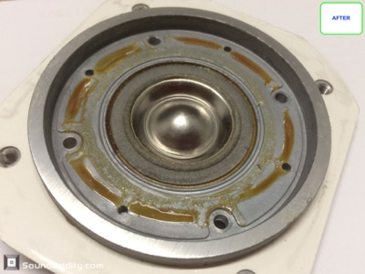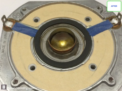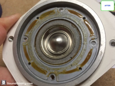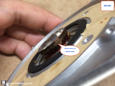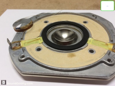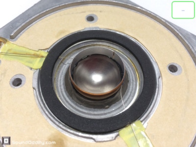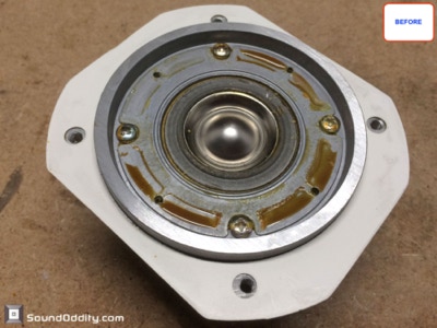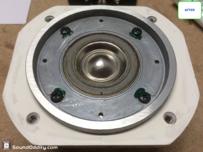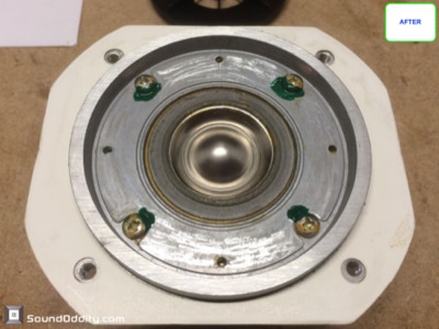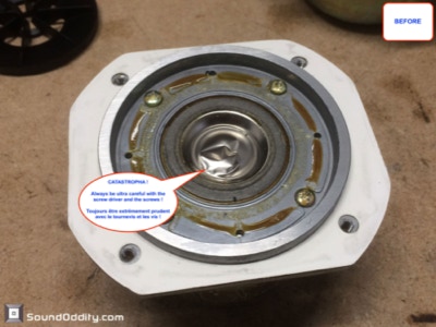 L’un des tweeters avait le dome enfoncé des suites d’un incident de vis chez le client ! Soyez toujours extrêmement vigilant avec les tournevis et vis autour des HP. J’ai hésité à le réparer ou non puis j’ai finalement décidé de le faire pour la science, ces tweeters étants extrêmement rares. Le résultat de la réparation est étonnamment bon !